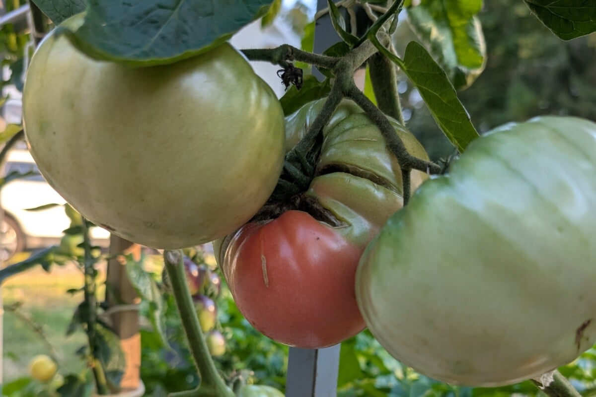Tomatoes begin ripening from the inside out. That’s because ethylene is produced first in the center of the tomato. Once the tomato reaches a certain point of ripeness, you can actually pick the tomato, and it will continue to ripen off the vine. It doesn’t need to be on the vine or in the sun to continue to develop flavor. In fact, once the tomato reaches the breaker stage, it is actually sealed off at the stem from the rest of the plant and no longer receives nutrients anymore. You can read all about the breaker stage and how to recognize it here.