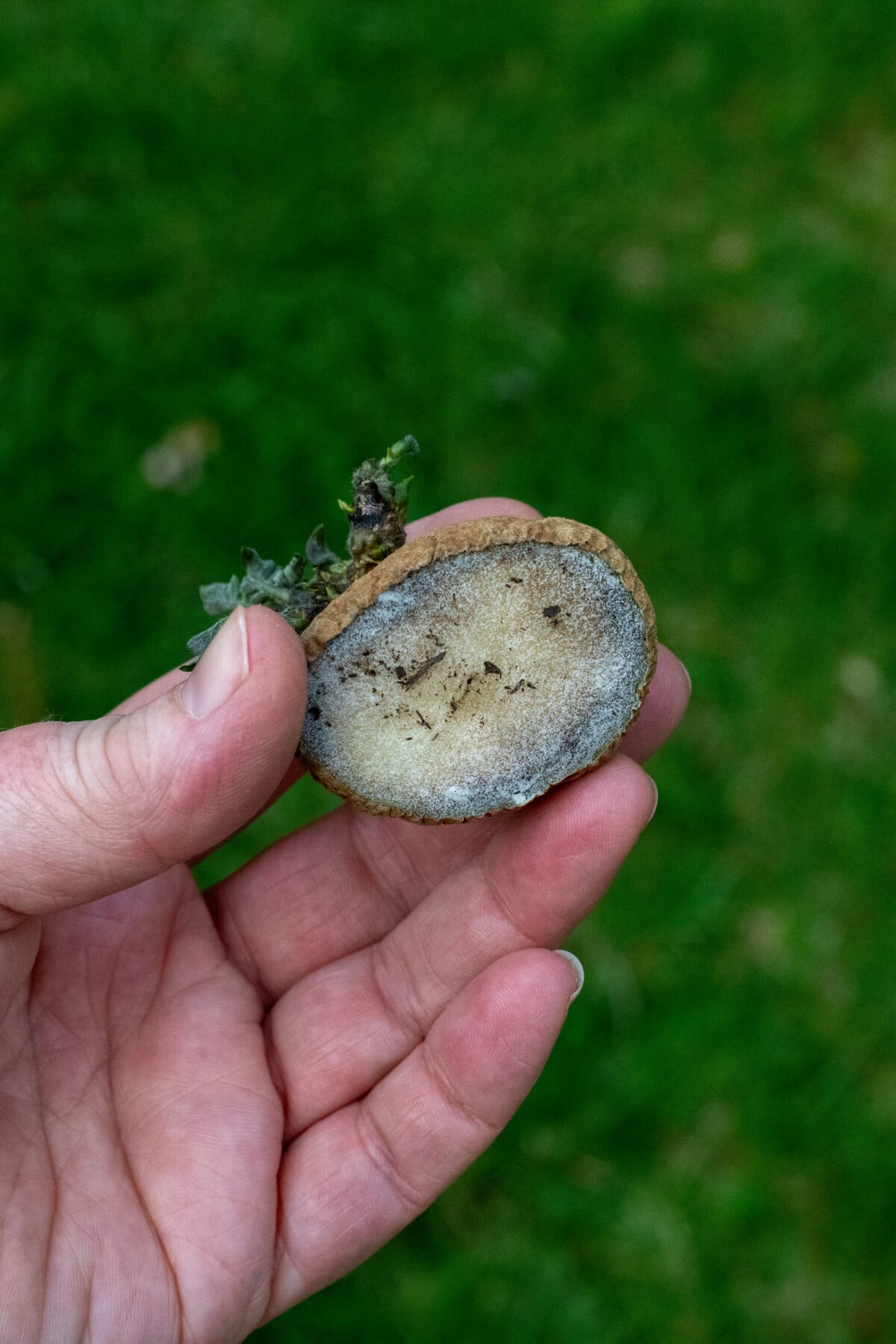 For larger potatoes with many sprouts, such as this Russet, you’ll want to cut the seed potato into individual pieces, each with a sprout on it. Let the cut potato pieces dry out or scab over. You can do this by leaving it out in the bright sun for an hour or two, or simply waiting and planting it the next day. This will prevent the seed potato from rotting once it’s buried in the soil.