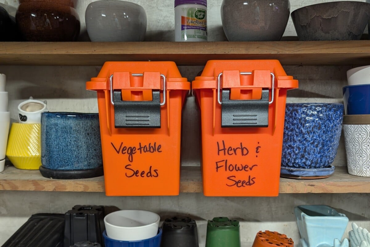I was at Rural King one day to buy sunflower seeds for my bird feeders when I noticed several pallets of bright orange seed storage containers for sale. Okay, they were ammo cans, but all I saw were plastic boxes that are near water-tight, air-tight, keep out the light and roughly the same size as my seed packets. Eureka! (You can also order them here.)